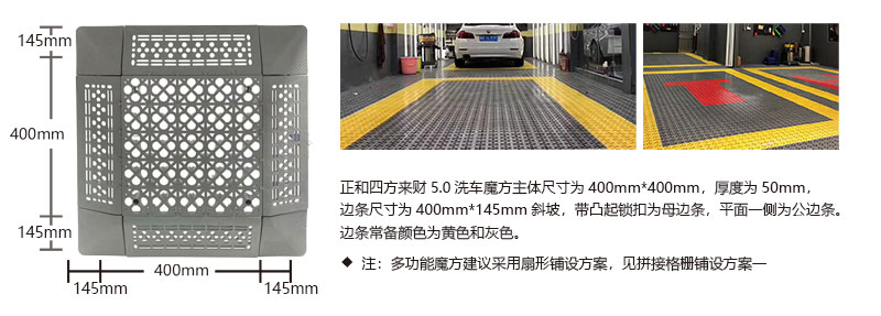 1. 分為3.4.5.厚度,解決不同厚度,統(tǒng)一紋路的問題 2. 啞光平紋設(shè)計(jì),防滑,美觀,易清潔 3. 選用高級(jí)原料,加入其他輔料,顏色亮麗,無異味,無污染 4. 顏色為紅黃藍(lán)綠黑灰六色,滿足客戶用色需求,搭配屬于自己的風(fēng)格 5. 通扣鎖扣設(shè)計(jì),容易鋪設(shè)且容易拆卸打理 6. 加強(qiáng)支撐,不容易出現(xiàn)壓壞壓斷現(xiàn)象,滿足大多數(shù)車輛施工的要求 7. 使用年限長(zhǎng),五年超長(zhǎng)質(zhì)保,使用無后顧之憂 8. 十字支撐,保證承載最大化的同時(shí),且易排泥排水