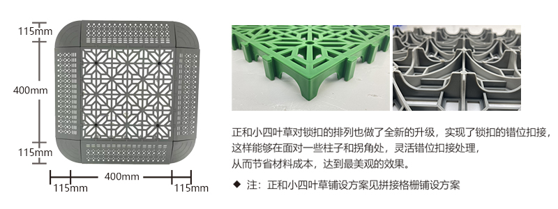 正和小四葉草采用通扣設計,可以確保產品鋪設完成后在任何區(qū)域單獨取出,極大的方便了客戶后期局部清理泥沙等,給店面的日常衛(wèi)生維護提供了很好的基礎。