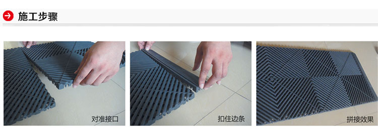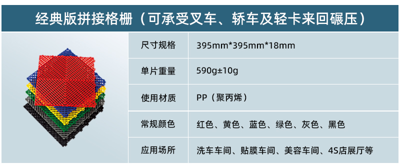 多功能拼接格柵具有高強承載、防水防油、色彩絢麗、施工簡便、防水防污、無臭無毒等諸多優(yōu)點,廣泛應(yīng)用于家庭陽臺、汽車美容快修店、汽車4S店、洗浴中心、公共衛(wèi)生間、展覽展會、賓館酒店過道等場所。