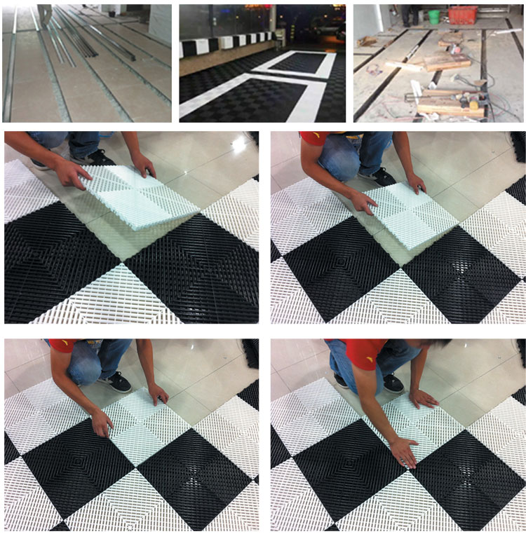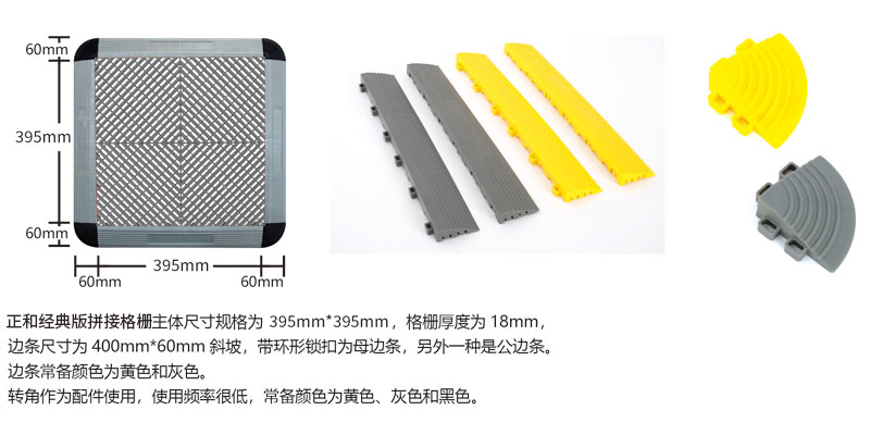 一套完整的拼接格柵產(chǎn)品由主體格柵、公邊條、母邊條、轉(zhuǎn)角四部分構(gòu)成,主體格柵的尺寸為395mm*395mm*18mm,厚度為18mm,邊條尺寸為400mm*60mm*8mm,轉(zhuǎn)角為扇形結(jié)構(gòu),尺寸規(guī)格為60mm*60mm*18mm。 拼接格柵通過一個簡便互鎖接口設(shè)計,重量輕,可拆卸,易于安裝。無需使用工具,即可快速構(gòu)建起堅實的展示地板地面。 拼接格柵重量輕、結(jié)構(gòu)緊湊,便于運輸或儲存。可廣泛用作汽車4S店展臺地板、汽車美容店地面、汽車貼膜車間、美容車間以及客戶休息室等場所,同時也適用于展覽、展會等臨時性場所的地面鋪設(shè)。在幾乎所有有水的場所拼接格柵都能使用。