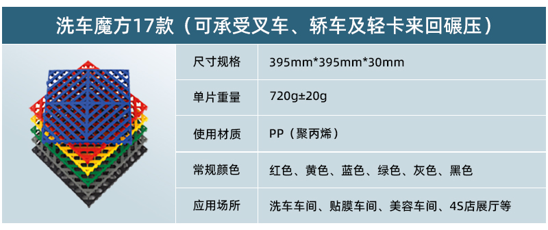 正和17款洗車魔方具有大孔徑排水和排泥沙的功能,下方支撐空間更大,鎖扣更加牢固,鋪裝方便快捷,效果美觀大方,解決了地下室、地暖系統(tǒng)的洗車難題,成為洗車車間地面的全新選擇。洗車魔方集玻璃鋼格柵的超強(qiáng)承載,排水排沙功能和拼接格柵的色彩絢麗,安裝方便功能于一身,是一款真正免挖溝一次性解決洗車間地面問題的超高性價(jià)比產(chǎn)品!
