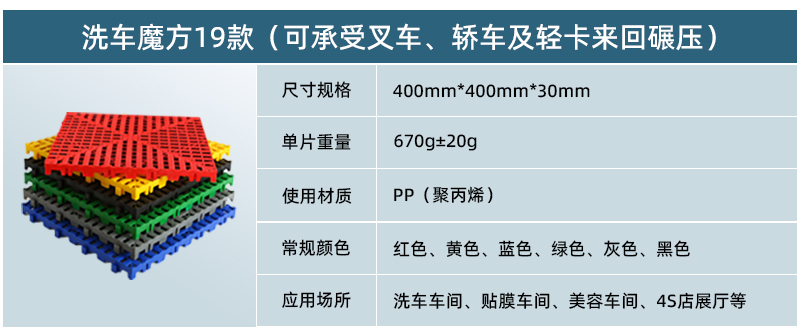 正和19款洗車魔方是正和公司2019年推出的新品,該產品厚度為30毫米,采用更為粗壯的加強筋和更為寬大的面層設計,是目前載重、抗沖擊效果最好的產品。