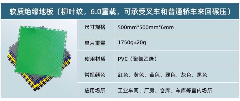 5、高承載,更防滑: 軟質(zhì)絕緣地板為實(shí)心結(jié)構(gòu),只要地面承重沒(méi)有問(wèn)題,其承載能力能夠達(dá)到每平米10噸以上。地板表面在生產(chǎn)過(guò)程中帶有
